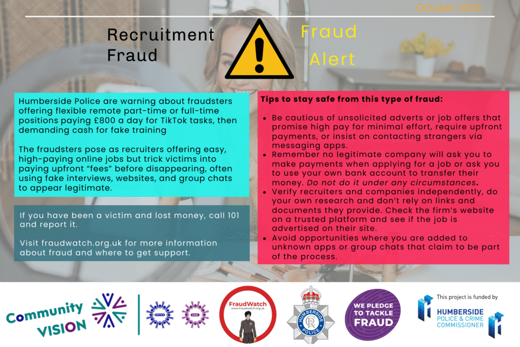Humberside Police are warning about fraudsters offering flexible remote part-time or full-time positions paying £800 a day for TikTok tasks, then demanding cash for fake training